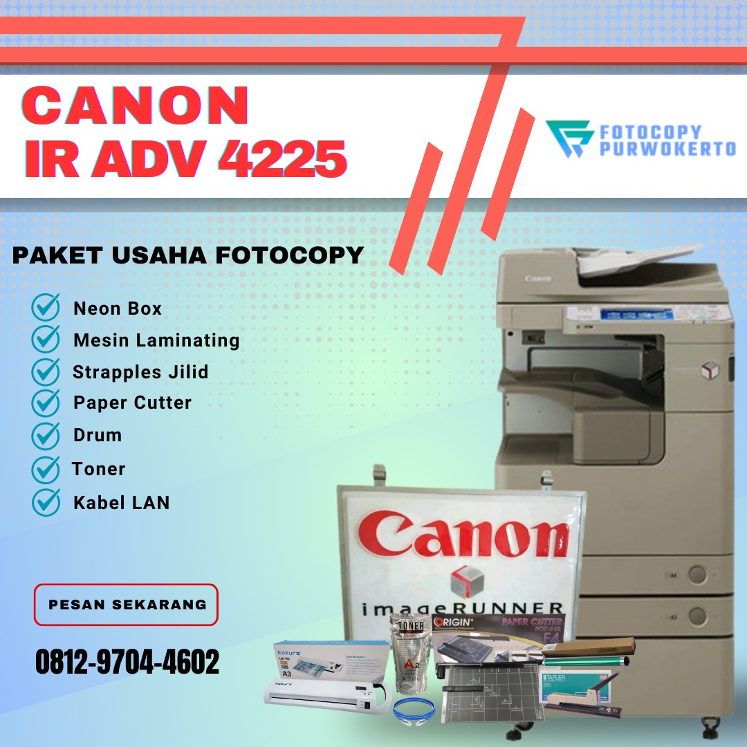 Paket Usaha Fotocopy SUPREME dengan mesin fotocopy Canon iRA 4025 / 4225, type mesin Canon yang paling banyak digunakan. Karena kualitas mesinnya yang terbilang bandel dan tahan lama.